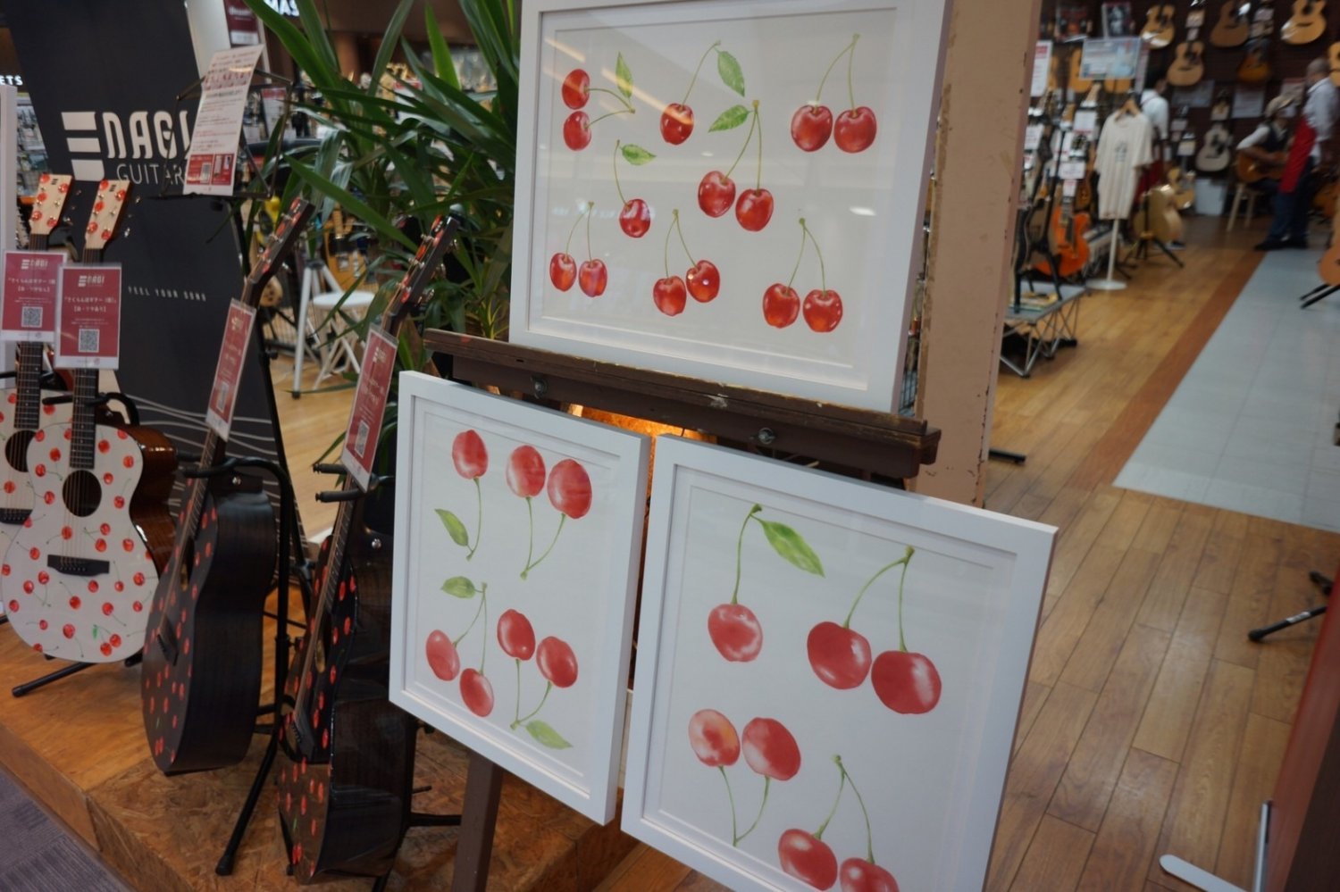 さくらんぼギターのボディTOPにプリントされている、みずみずしいチェリーの絵柄はイラストレーター/デザイナーのkiamu氏による水彩画。