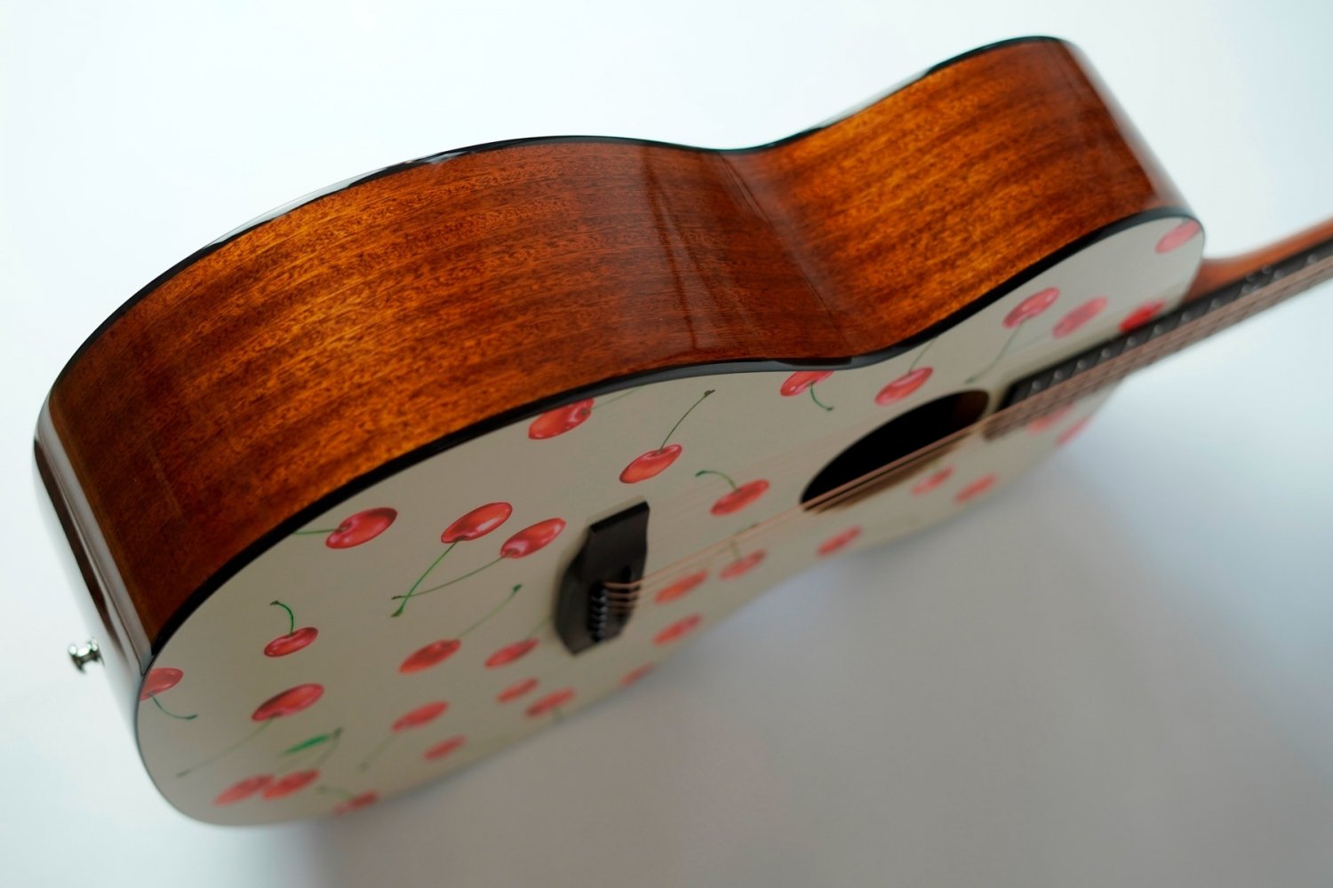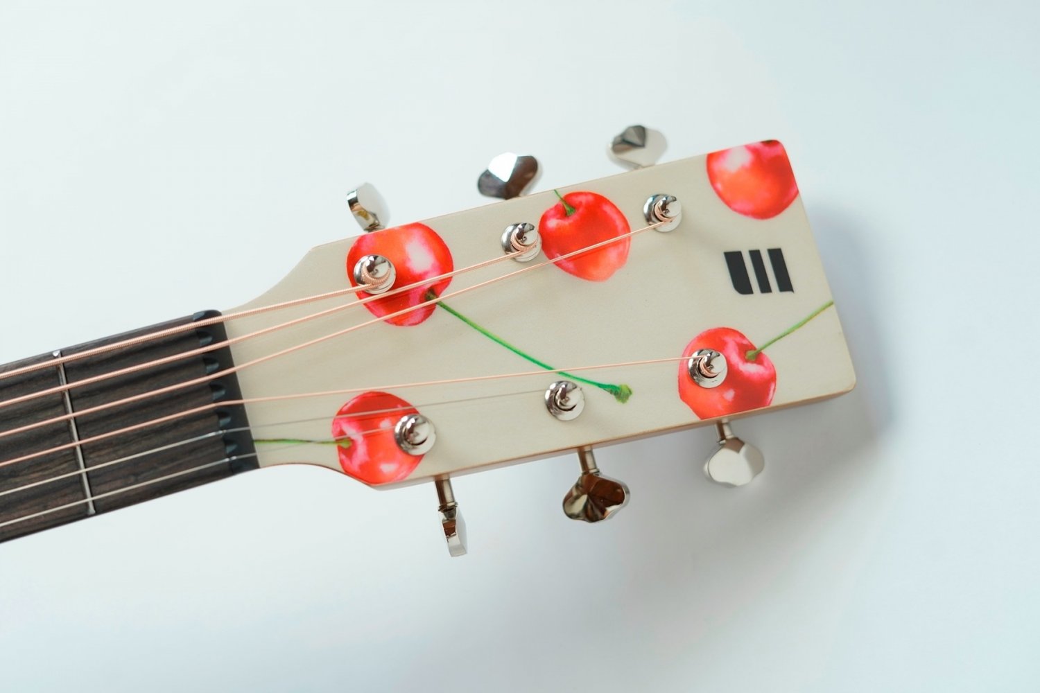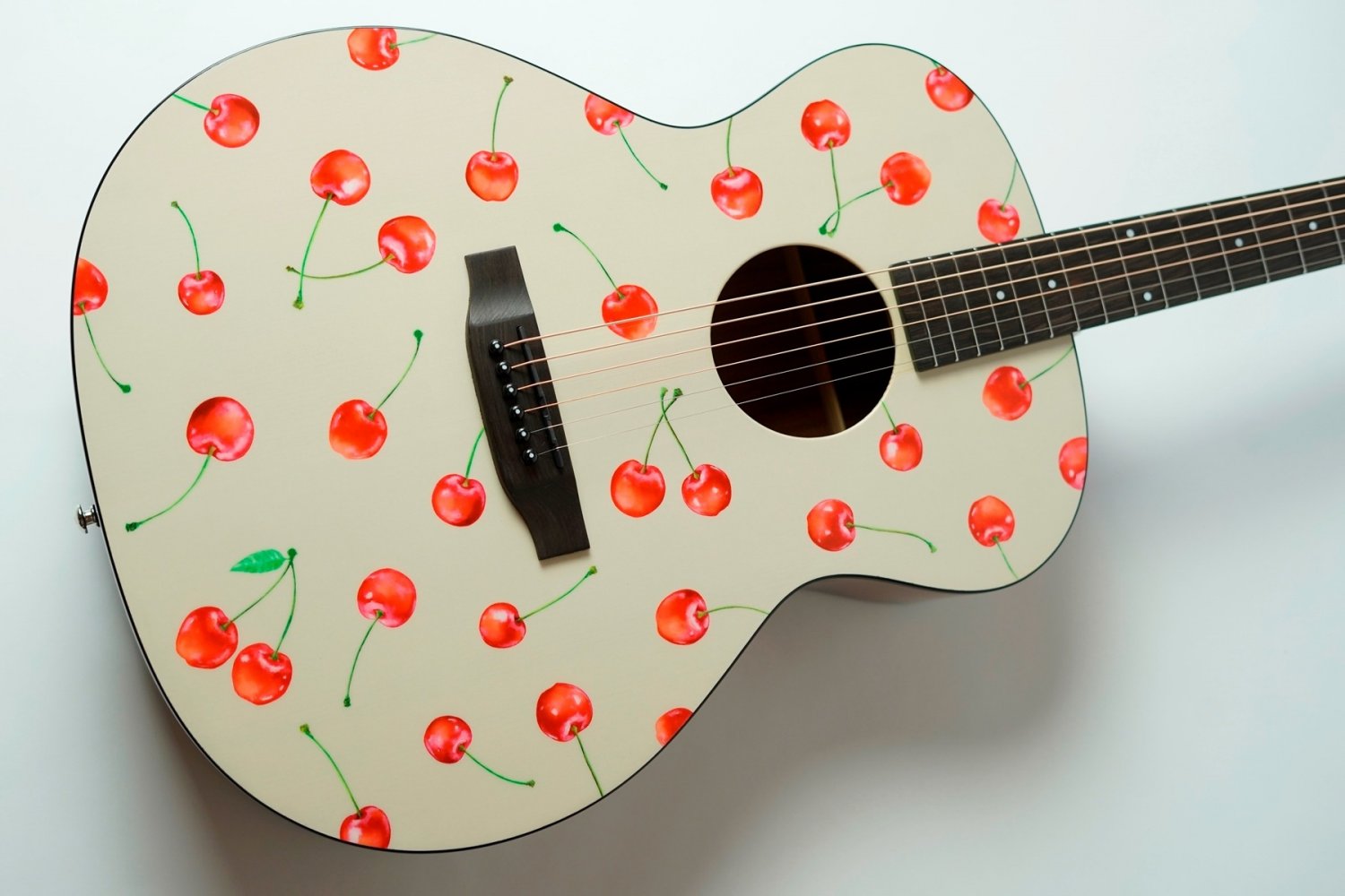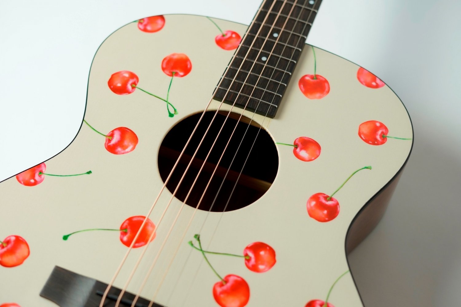 リミテッドモデルの記念すべき第一弾はデザイナー/イラストレーター「kiamu」とのコラボレーション。ボディトップにデザインされているチェリー柄はkiamuによる水彩画を独自技術で木材にプリントしています。さくらんぼのみずみずしさが伝わってくる繊細な表現はkiamuの手仕事による水彩画。原画がもつ温かな雰囲気をギターのデザインに合わせて再構成。「可愛くかっこいい」「持つだけで気分が上がる」そんなギターをイメージしました。
