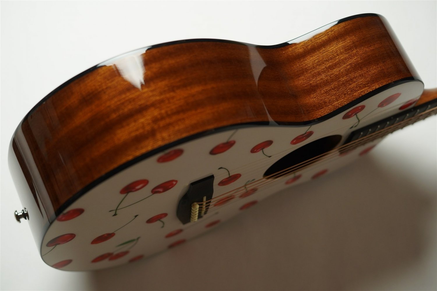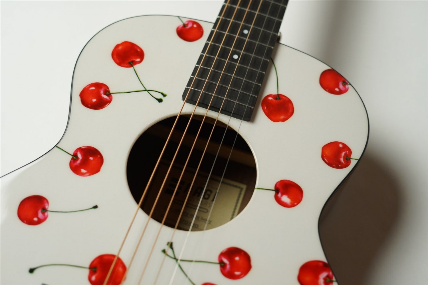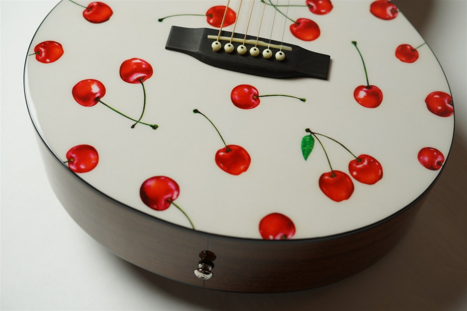 リミテッドモデルの記念すべき第一弾はデザイナー/イラストレーター「kiamu」とのコラボレーション。ボディトップにデザインされているチェリー柄はkiamuによる水彩画を独自技術で木材にプリントしています。さくらんぼのみずみずしさが伝わってくる繊細な表現はkiamuの手仕事による水彩画。原画がもつ温かな雰囲気をギターのデザインに合わせて再構成。「可愛くかっこいい」「持つだけで気分が上がる」そんなギターをイメージしました。