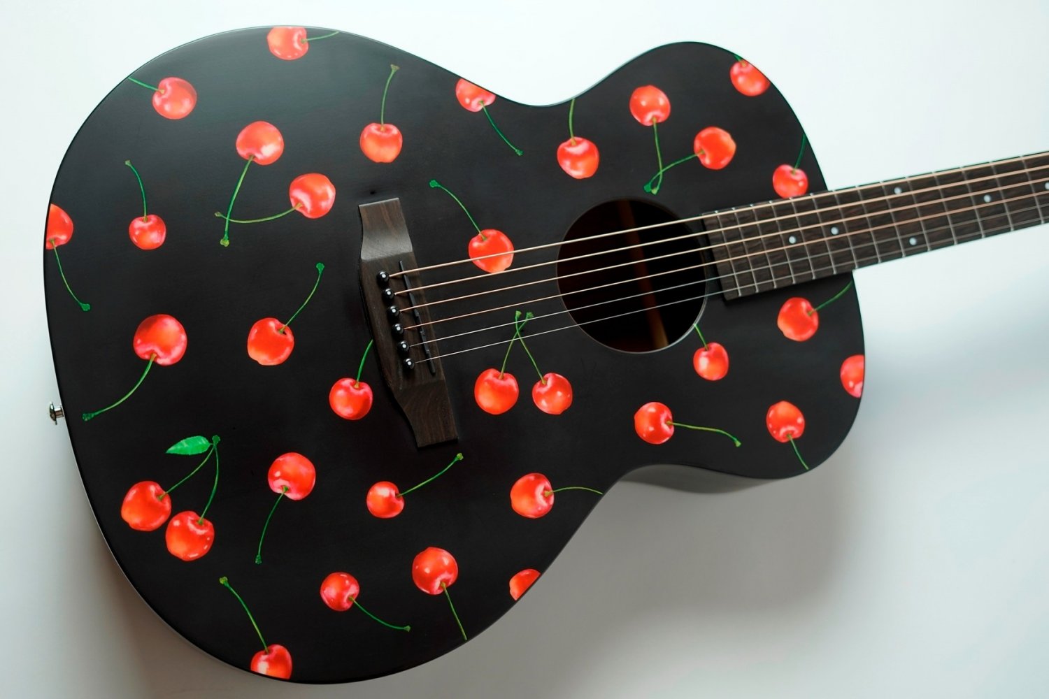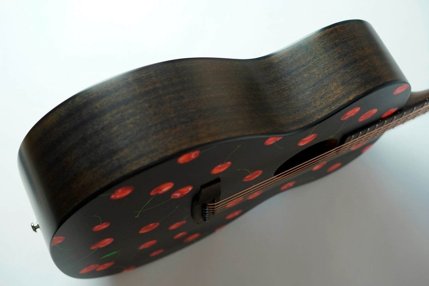 リミテッドモデルの記念すべき第一弾はデザイナー/イラストレーター「kiamu」とのコラボレーション。ボディトップにデザインされているチェリー柄はkiamuによる水彩画を独自技術で木材にプリントしています。さくらんぼのみずみずしさが伝わってくる繊細な表現はkiamuの手仕事による水彩画。原画がもつ温かな雰囲気をギターのデザインに合わせて再構成。「可愛くかっこいい」「持つだけで気分が上がる」そんなギターをイメージしました。