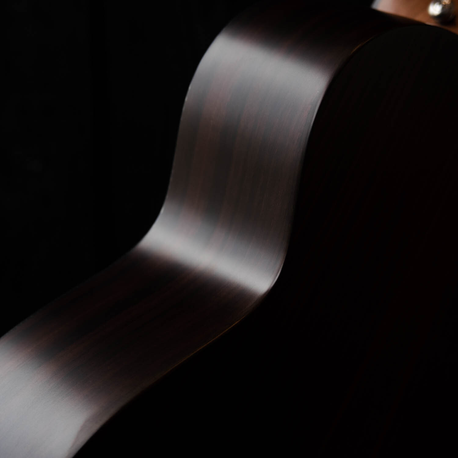 ネックはマホガニーとエンジニアードエボニーの5ピース材を使用し、ギターの特性上で必ず起こりうる反りに対処しています。ナット幅は44mmと一般的なサイズですが、ネックグリップは薄めで手の小さい方でも安心してお使いいただけます。指板とブリッジはエンジニアードエボニーを使用しシックなダークカラーで調和させています。指板のポジションマークにはロゼッタ同様にアバロン貝のスモールドットを採用し、さりげない主張が全体の雰囲気をまとめています。